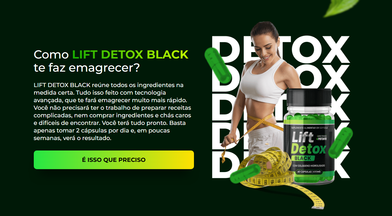 O Lift Detox Black é um suplemento 100% natural, aprovado pela Anvisa, que atua diretamente na eliminação de toxinas, aceleração do metabolismo e redução de gordura abdominal.